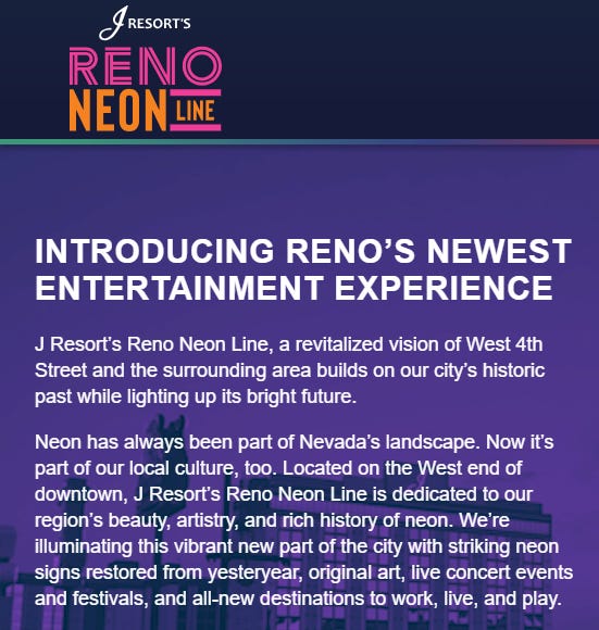 (If you want to learn more about Reno’s actual relationship with neon and the signs that authentically tell that story, please follow and support The Light Circus as it prepares to open in the National Bowling Stadium early next year. And if you want to see what authentic districts are all about, be sure to check out MidTown, the Riverwalk, Wells Avenue, and the Brewery District.)