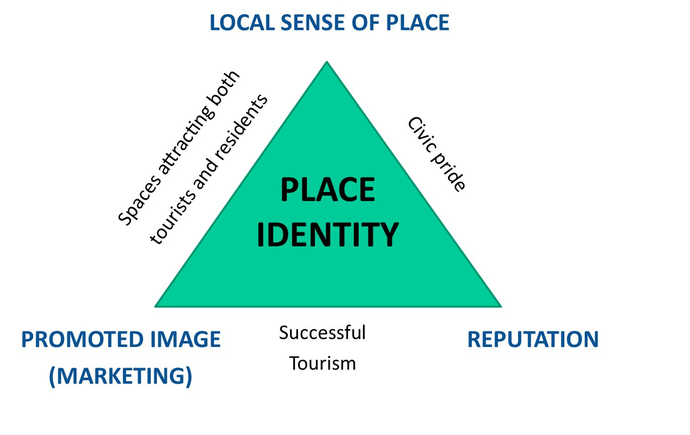 Looking on the left side of the triangle, you can see that when the promoted image and local sense of place are in alignment, the place attracts both residents and tourists—the ultimate goal of urban tourism. Tourists, after all, want to experience cities as its residents do, craving an authentic taste of what makes a place unique and special.
